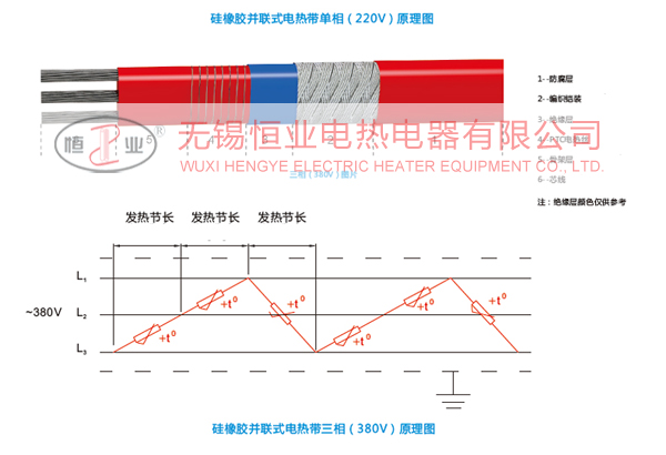 硅橡膠并聯(lián)式電熱帶的電源母線為二根或三根平行絕緣銅絞線, 在硅橡膠骨架層上纏繞P T C合金絲, 并將PTC合金電熱絲每隔一定距離相間交叉即“發(fā)熱節(jié)長"與母線連接,形成連續(xù)并聯(lián)電阻,母線通電后,各并聯(lián)電阻發(fā)熱,因而形成一條連續(xù)的電熱帶。硅橡膠并聯(lián)式電熱帶每米有一定標稱功率,使用的電熱帶越長,輸出的總功率越大,但由于采用PTC合金絲作為發(fā)熱元件,因此,其本身具有隨溫度變化而調(diào)節(jié)輸出功率的特性,且電熱帶采用硅橡膠作為絕緣材料,因此,帶體柔軟,便于安裝。該電熱帶在現(xiàn)場能按實際需要長度任意剪切。